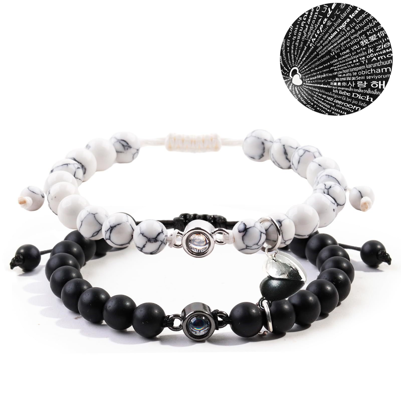 White Turquoise & Black Lava Stone Couple Magnetic Bracelets, ‘I Love You’ in 100 Languages Projection Stone Gift for College Students